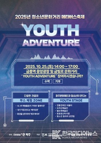 [ 한국미디어뉴스 이원희 기자 ] (재)파주시청소년재단 금촌청소년문화의집은 오는 2025년 10월 25일 토요일 금릉역 중앙광 및 금빛로 문화거리 일대에서 2025년 청소년문화거리메타버스축제 ‘YOUTH ADVENTURE’를 개최한다고 밝혔다.