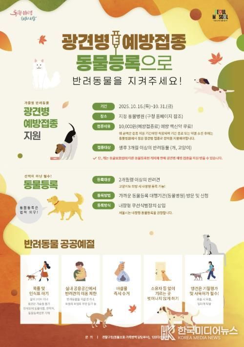 [ 한국미디어뉴스 이보영 기자 ] 마포구는 10월 31일까지 광견병 발생 및 확산을 예방하기 위해 관내 40곳 동물병원에서 ‘2025년 가을철 광견병 예방접종’을 실시한다.