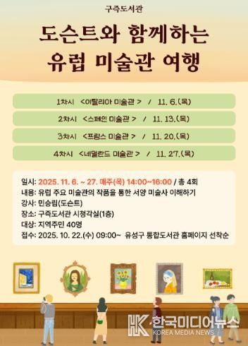 [ 한국미디어뉴스 이보영 기자 ] 대전 유성구는 11월 6일부터 27일까지 매주 목요일 구즉도서관에서 ‘도슨트와 함께하는 유럽 미술관 여행’ 강연을 개최한다.