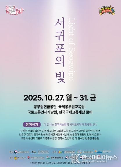 ‘예술이다 서귀포, 혁신이 주는 달콤함’의 피날레를 함께하는 한국미술협회 서귀포지부와 함께하는 특별기획전시 '로비가 미술관: 서귀포의 빛'이 27일(월)부터 31일(금)까지 추진된다. 전시는 공무원연금공단, 국세공무원교육원, 국토교통인재개발원, 한국국제교류재단 로비에서 동시에 펼쳐지며, ‘서귀포의 빛’이라는 주제로 아름답게 빛나는 서귀포의 모습과 색감을 작가들의 다양한 감성으로 표현된 작품을 선보인다. 매일 스쳐지나가는 로비의 풍경에서 영감이 가득한 일터로의 변화를 느낄 수 있도록 기획했다.