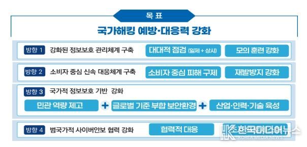 [ 한국미디어뉴스 이원영 기자 ] 과학기술정보통신부와 관계부처는 전방위적인 해킹 사고로 국민 불안이 가속화되는 현 상황을 신속히 극복하고 국가 전반의 정보보호 역량을 강화하기 위해 '범부처 정보보호 종합대책'을 수립하여 10월 22일 대국민 브리핑을 통해 발표했다.