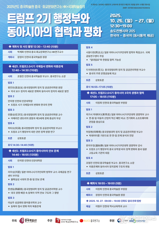 [ 한국미디어뉴스 이원영 기자 ] 국립인천대 중국학술원 중국·화교문화연구소(소장: 장정아 교수)는 오는 10월 26일(일) 인천 송도 컨벤시아에서 국제학술회의‘트럼프 2기 행정부와 동아시아의 협력과 평화’를 개최한다.