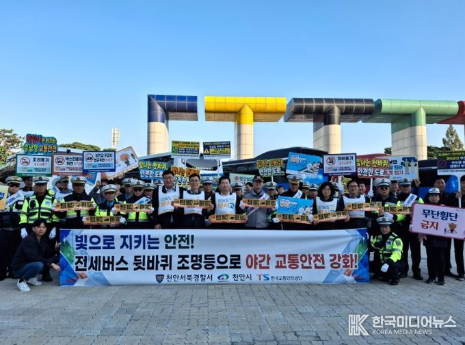 [ 한국미디어뉴스 김서안 기자 ] 천안시는 지난 28일 천안종합운동장 오륜문광장에서 야간 교통사고 예방을 위한 전세버스 뒷바퀴 조명등 장착 행사를 개최했다.