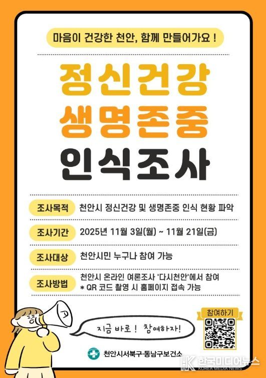 [ 한국미디어뉴스 김서안 기자 ] 천안시는 다음달 3일부터 21일까지 천안시민을 대상으로 정신건강 및 생명존중에 대한 인식조사를 실시한다.