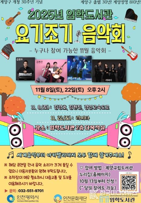[ 한국미디어뉴스 황영수 기자 ] 인천 계양구 임학도서관(관장 권경회)에서 지역 주민을 대상으로 ‘요기조기 음악회’를 개최한다.