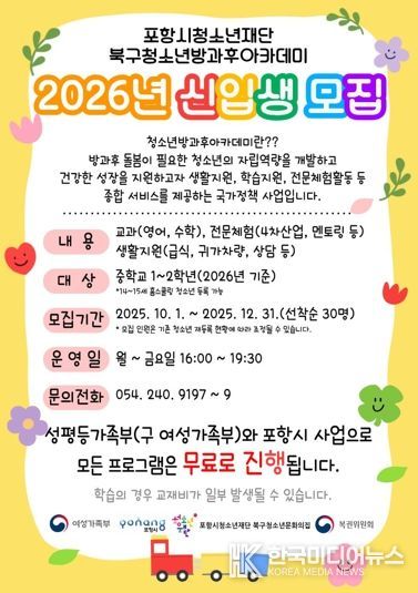 [ 한국미디어뉴스 이보영 기자 ] 포항시청소년재단은 북구청소년문화의집 내 북구청소년방과후아카데미에서 2026년도 신입생을 선착순 모집한다고 밝혔다.