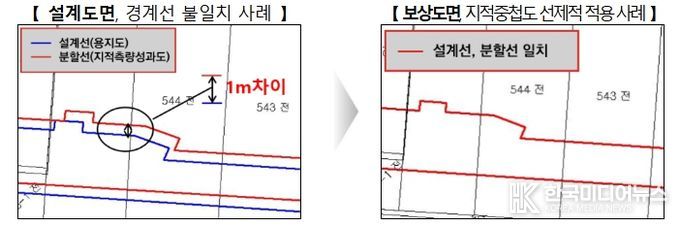 설계도면과 보상도면 간 경계선 차이의 선제적 해소를 위해 실시설계 단계에서 지적중첩도 작성과 선지정 지적현황측량을 실시한다.