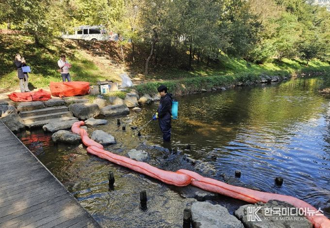 이번 훈련은 탱크로리 차량의 전복사고로 유류가 장수천에 유입된 상황을 가상하여 진행됐다.