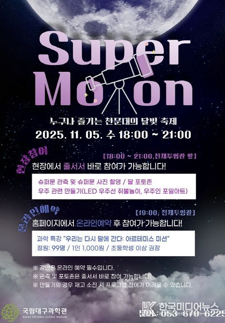 [ 한국미디어뉴스 이보영 기자 ] 국립대구과학관은 개기월식을 기념해 11월 5일 ‘2025년 슈퍼문 관측행사: 슈퍼문이 돌아왔다’를 개최한다.