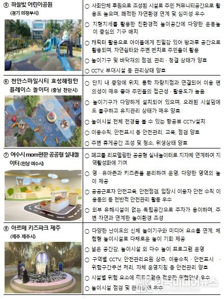 올해에는 전국 8만 4천여 개의 어린이놀이시설 중 시도 및 시도 교육청에서 추천한 46개 시설을 대상으로, 전문가·현장 심사*를 거쳐 최종 8곳을 선정했다.