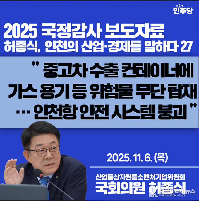 허 의원은 이어 “해양수산부, 관세청, 인천항만공사 등 관계기관은 책임을 통감하고, 중고차 수출 화물 관리 전반과 항만 위험물 통제 시스템을 시급히 재점검해 재발 방지 대책을 마련해야 한다”고 촉구했다.
