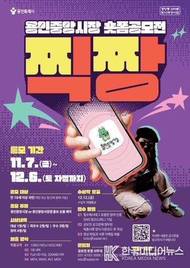 시 관계자는 “이번 숏폼 공모전은 시민이 직접 용인중앙시장의 매력과 전통문화를 재발견하고, 디지털 감성으로 전통시장 브랜드를 확산시키는 계기가 될 것”이라며 “청년들의 창의력으로 중앙동 도시재생 사업이 더욱 풍성하게 실현되길 기대한다”고 말했다.