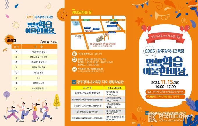 [ 한국미디어뉴스 이종철 기자 ] 광주시교육청금호평생교육관은 오는 15일 광주시교육청학생독립운동기념회관 야외 일원에서 시민 등을 대상으로 ‘2025 광주광역시교육청 평생학습 어울 한마당’을 개최한다.