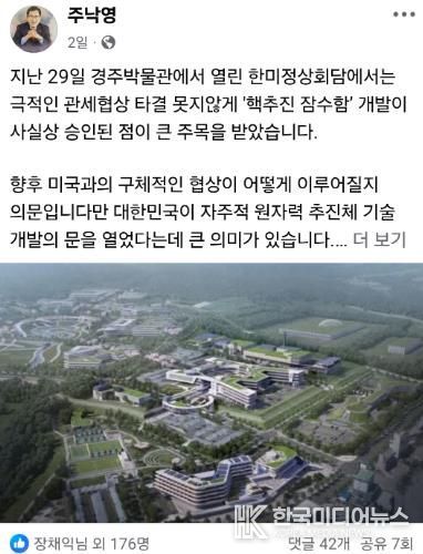 [ 한국미디어뉴스 이보영 기자 ] 주낙영 경주시장이 최근 자신의 사회관계망서비스(SNS)에 “감포에 건립 중인 문무대왕과학연구소가 향후 핵추진 잠수함 추진체 기술의 기반이 될 수 있다”고 게시했다.