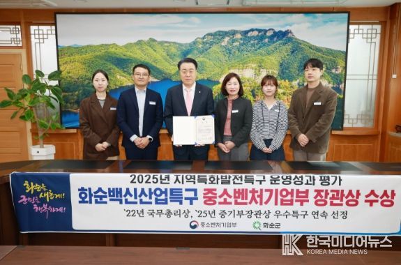 [ 한국미디어뉴스 이종철 기자 ] 화순군은 중소벤처기업부에서 실시하는 '2025년도 지역특구 운영 성과 평가에서 화순백신산업특구가 ‘우수 특구’로 선정돼 중소벤처기업부 장관상의 영예를 차지했다고 10일 밝혔다.