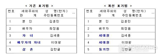 앞으로 등·초본에는 세대주의 배우자 외 가족(부모, 조부모, 형제자매 등)은 ‘세대원’, 그 외에는 ‘동거인’으로 표기된다. 다만, 민원인이 희망하는 경우 기존 표기법대로 등·초본에 상세한 가족 관계를 표기할 수 있다.