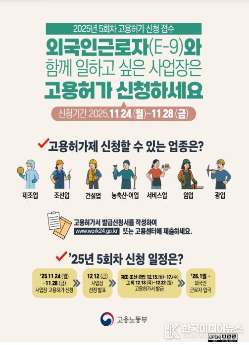 [ 한국미디어뉴스 이원영 기자 ] 고용노동부는 11월 24일부터 11월 28일까지 전국 지방고용노동관서를 통해 외국인근로자(E-9)에 대한 올해 5회차 신규 고용허가 신청을 받는다.