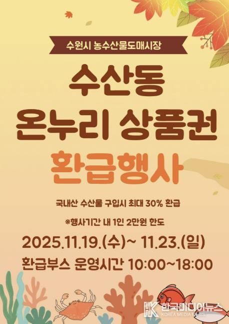 [ 한국미디어뉴스 이보영 기자 ] 수원시농수산물도매시장 수산동이 11월 19일부터 23일까지 온누리상품권 환급 행사를 연다. 행사 기간에 국내산 수산물을 구매하면 최대 2만 원을 온누리상품권으로 환급받을 수 있다.