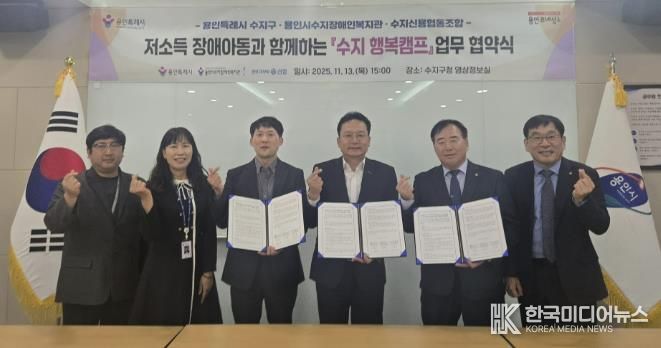 [ 한국미디어뉴스 이원영 기자 ] 용인특례시 수지구는 13일 용인시수지장애인복지관과 수지신용협동조합과 함께 저소득 장애아동의 복지 향상과 장애 인식 개선을 위한 ‘수지 행복캠프’ 추진 업무협약을 체결했다고 14일 밝혔다.