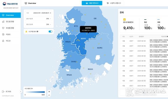 [ 한국미디어뉴스 이원영 기자 ] 소방청은 소방대원의 현장 안전사고 및 소방차 교통사고를 보다 효율적으로 관리하고 예방하기 위해 데이터 시각화 시스템을 구축했다고 밝혔다. 이번 시스템은 소방청에서 제공한 최근 5년간의 안전사고 데이터를 기반으로, 소방대원의 사고 경향 분석을 지원하며, 이를 통해 효율적인 사고 예방 및 재발 방지 대책 수립을 돕는다.