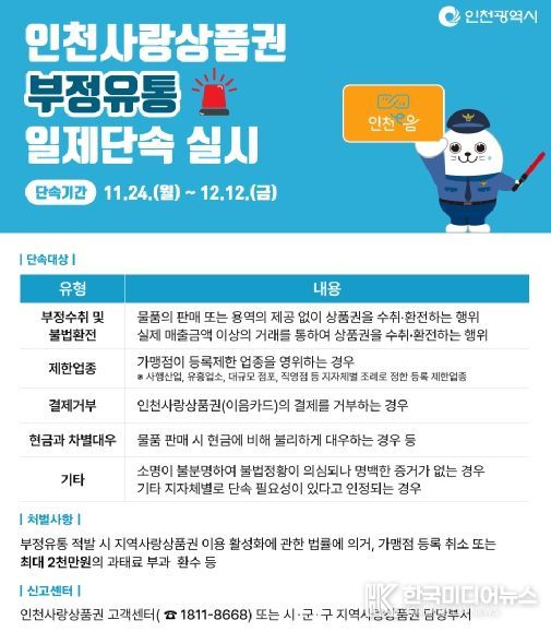 [ 한국미디어뉴스 이원영 기자 ] 인천광역시는 11월 24일부터 12월 12일까지 인천사랑상품권의 부정 유통을 방지하고 건전한 유통 질서를 확립하기 위해 일제 단속을 실시한다고 밝혔다.