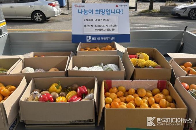 [ 한국미디어뉴스 이보영 기자 ] 지난 17일, 용인시 소재 더라이프지구촌교회 광교채플에서 추수감사절을 맞아 영통1동 행정복지센터에 샤인머스켓, 망고, 파인애플, 배, 귤, 사과, 감 등 과일 11박스를 기부했다.