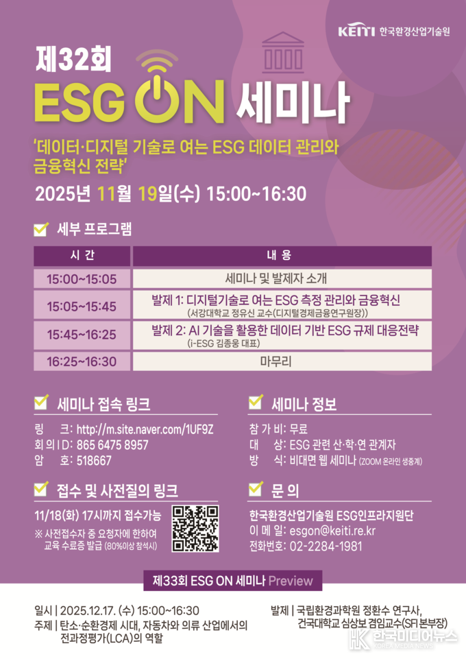 [ 한국미디어뉴스 이원영 기자 ] 한국환경산업기술원은 ‘데이터·디지털 기술로 여는 환경·사회·투명경영(ESG) 데이터 관리와 금융혁신 전략’을 주제로 11월 19일 오후 3시 ‘제32회 이에스지(ESG) 온(ON) 세미나’를 온라인으로 개최한다고 18일 밝혔다.