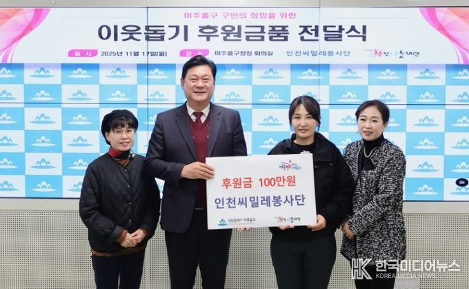 [ 한국미디어뉴스 최치남 기자 ] 인천 미추홀구는 지난 17일 구청장실에서 인천씨밀레봉사단(단장 양수진)으로부터 기부금 100만 원을 전달받았다.