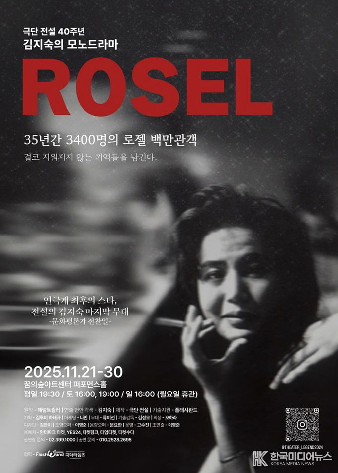 [ 한국미디어뉴스 이원영 기자 ] 극단 전설 40주년 기념작이자 배우 김지숙의 마지막 공연인 모노드라마 〈로젤〉이 오는 11월 21일부터 30일까지 꿈의숲아트센터 퍼포먼스홀에서 막을 올린다. 35년간 3,400회 이상 공연되며 백만 명이 넘는 관객을 울린 이 작품은 여성의 주체성과 인간성의 회복을 그린 한국 연극사의 대표작으로 꼽힌다.