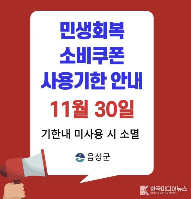 [ 한국미디어뉴스 김풍옥 기자 ] 음성군은 민생회복 소비쿠폰 사용기한이 이달 30일로 다가옴에 따라 미사용 군민들에게 기한 내 사용을 당부했다.