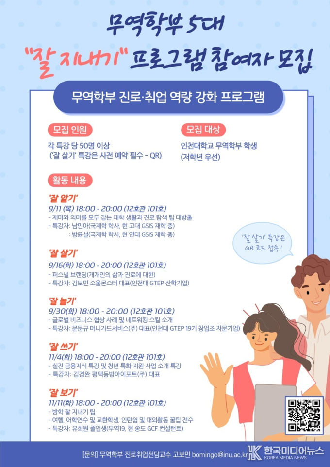 [ 한국미디어뉴스 이원영 기자 ] 인천대 무역학부는 지난 9월부터 저학년 학생들의 진로 탐색과 취업 경쟁력 강화를 위해 ‘청년 무역인 잘 지내기 5대 프로그램’을 기획·운영하였다고 19일 밝혔다.