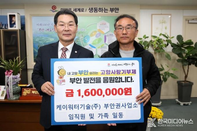 [ 한국미디어뉴스 이종철 기자 ] 부안군은 지난 18일 케이워터기술㈜ 부안권사업소 임직원과 가족들이 고향사랑기부금 160만 원을 기탁했다고 밝혔다.