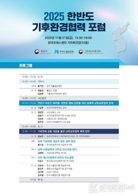 [ 한국미디어뉴스 이원영 기자 ] 통일부는 11월 21일 오후, ‘한국프레스센터’(서울시 중구 소재)에서 '2025 한반도 기후환경협력 토론회'를 개최한다.