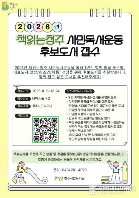 [ 한국미디어뉴스 김풍옥 기자 ] 청주시립도서관은 시민 독서운동 ‘책읽는청주’의 2026년도 대표도서 선정을 위해 오는 12월 24일까지 시민 추천을 접수한다고 21일 밝혔다.