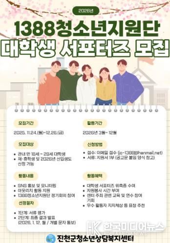 [ 한국미디어뉴스 김풍옥 기자 ] 충북 진천군청소년상담복지센터는 이달 24일부터 대학생 대상 서포터즈 프로그램 ‘2026년 1388청소년지원단 대학생 서포터즈’ 참가자를 모집한다고 밝혔다.