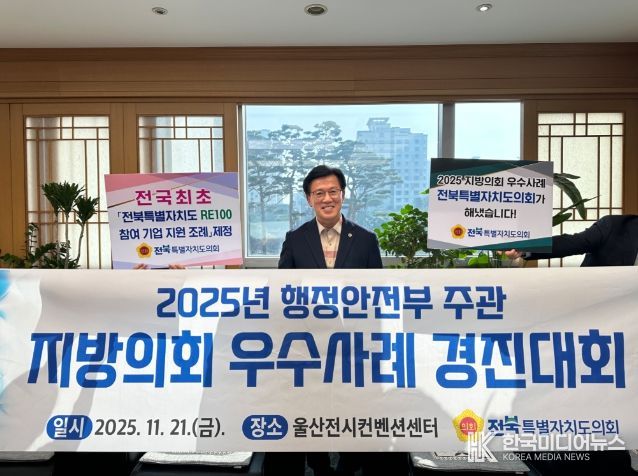 [ 한국미디어뉴스 이종철 기자 ] 전북특별자치도의회가 지난 21일 울산전시컨벤션센터에서 열린 행정안전부 주관 ‘2025년 지방의회 우수사례 경진대회’에서 본선에 진출해 수상하는 영예를 안았다.
