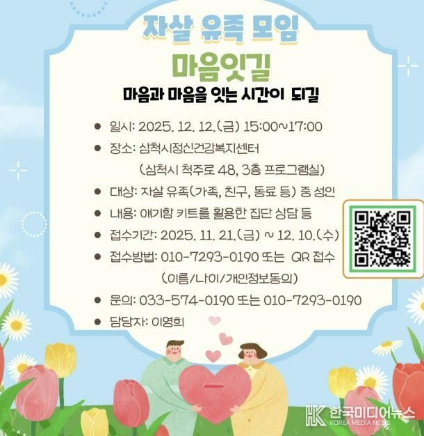 [ 한국미디어뉴스 이원영 기자 ] 삼척시정신건강복지센터는 오는 12월 12일에 올해 마지막 ‘2025년 자살 유족 모임’을 진행한다고 밝혔다. 올해 네 번째로 열리는 정기 모임으로, ‘얘기함 키트’를 활용한 프로그램이 센터 내에서 운영될 예정이다.
