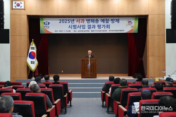 [ 한국미디어뉴스 이종철 기자 ] 무주군은 지난 25일 농민의 집 농민마당에서 ‘2025 사과 병해충 예찰 방제 시범사업’ 평가회를 개최했다고 밝혔다.