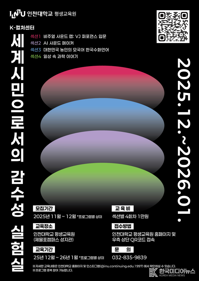 [ 한국미디어뉴스 이원영 기자 ] 인천대학교 평생교육원 K-컬처센터는 오는 12월부터 시민들이 글로벌 감수성·문화 다양성·디지털 창작 역량을 실험적으로 경험할 수 있는 신규 프로그램「세계시민으로서의 감수성 실험실」을 운영한다고 27일 밝혔다.