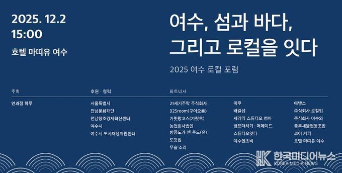[ 한국미디어뉴스 이종철 기자 ] 여수시는 ‘연과점 하루’가 오는 12월 2일 오후 3시 마띠유호텔에서 ‘여수, 섬과 바다, 그리고 로컬을 잇다 - 2025 여수 로컬 포럼’을 개최한다고 밝혔다.