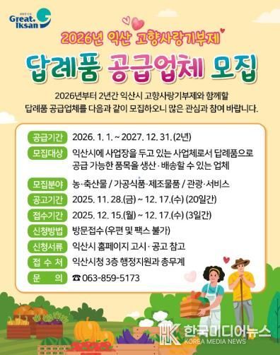 익산시는 2026~2027년 고향사랑기부제 답례품을 공급할 지역 업체를 오는 15~17일 공개 모집한다.
