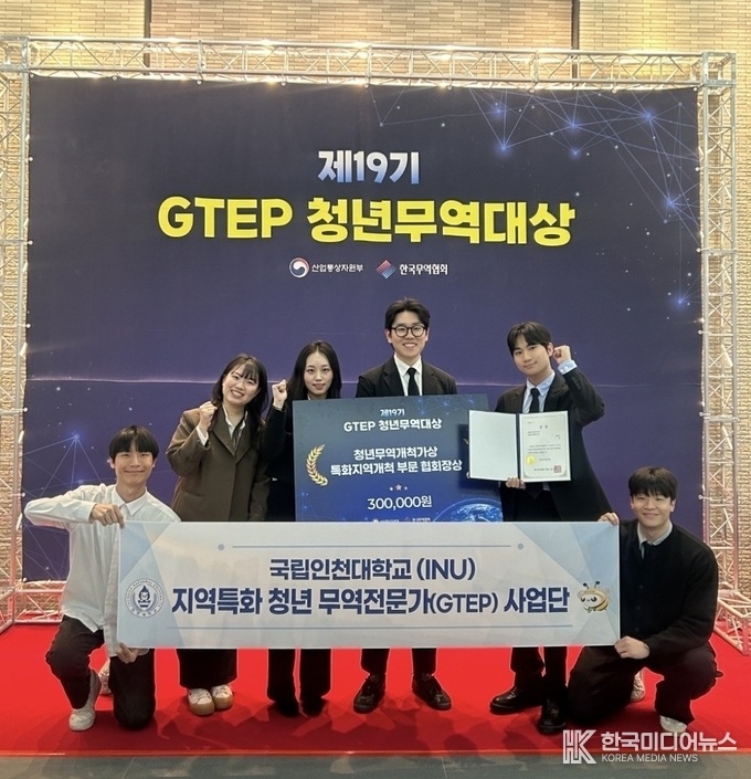 [ 한국미디어뉴스 이원영 기자 ] 인천대학교 GTEP 특화지역(중동) 대표팀 ‘첩첩산중’이 2025년 제19기 GTEP 청년무역대상 본선(12월 1일, 코엑스 401호)에서 전국 본선 진출 6팀 중 하나로 선정되어 ‘무역협회장상(특화지역개척 부문·중동)’을 수상했다고 2일 밝혔다.