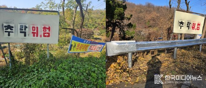 이 도로는 차량이 일반 우회전 각도로 진입할 경우 약 10m 아래로 추락할 위험이 있어, 주민들이 자비로 ‘추락 위험’ 안내문을 설치할 정도로 사고 위험이 높았던 곳이다.