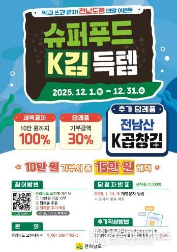 [ 한국미디어뉴스 이종철 기자 ] 전라남도가 연말을 맞아 고향사랑기부제 참여 확대와 지역 수산물 소비 촉진을 위해 슈퍼푸드 케이(K)김을 활용한 대규모 연말 이벤트를 진행한다.