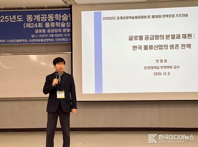 [ 한국미디어뉴스 이원영 기자 ] (사)한국물류학회는 지난 6일 인천대학교 송도캠퍼스에서 「2025년도 동계공동학술발표대회 및 제26회 물류정책포럼」을 개최하고 글로벌 공급망 분열·재편 속에서 한국 물류산업이 나아갈 전략 방향을 집중 논의했다.
