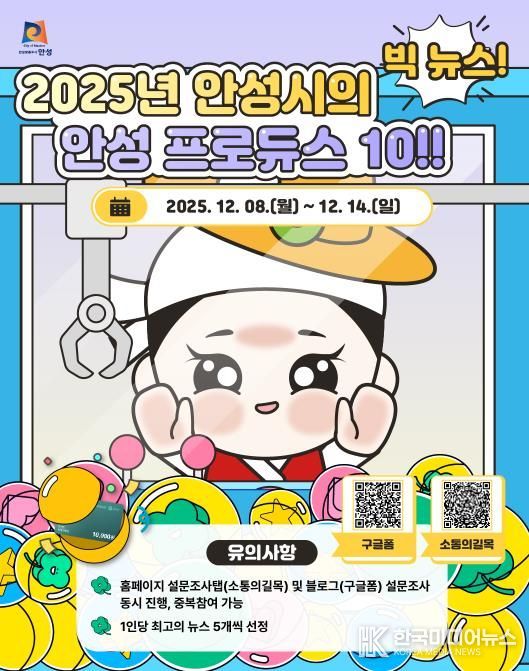 [ 한국미디어뉴스 이원영 기자 ] 안성시는 8일부터 14일까지 7일간 ‘2025년을 빛낸 안성시 10대 뉴스’ 선정을 위한 온·오프라인 시민 투표를 진행한다고 밝혔다.