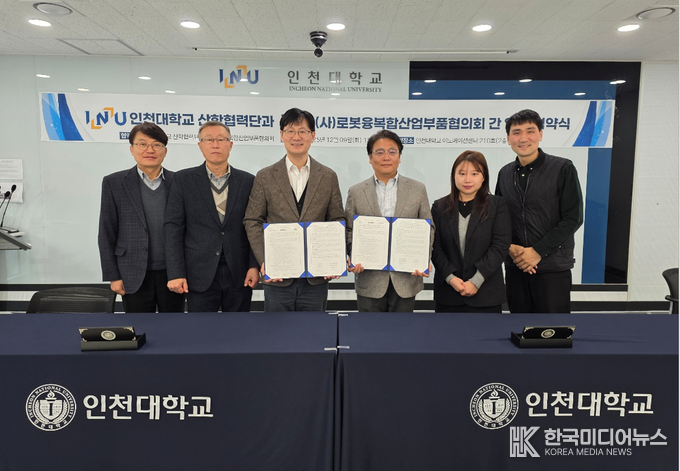 [ 한국미디어뉴스 이원영 기자 ] 인천대학교 산학협력단(단장 강동구)은 12월 9일(화) 인천대학교 이노베이션센터 대회의실에서 (사)로봇융복합산업부품협의회(회장 전종훈, 이하 “협의회”)와 로봇산업 기반 산학협력 활성화를 위한 업무협약(MOU)을 체결했다.