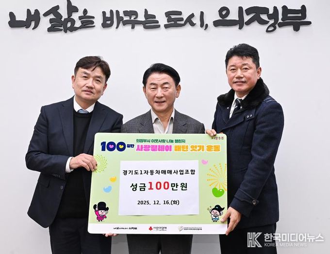 [ 한국미디어뉴스 김서안 기자 ] 의정부시는 12월 16일 경기도1자동차매매사업조합 의정부지부가 지역사회 나눔 문화 확산을 위한 ‘100일간 사랑릴레이 배턴 잇기’에 동참해 성금 100만 원을 기부했다고 밝혔다.