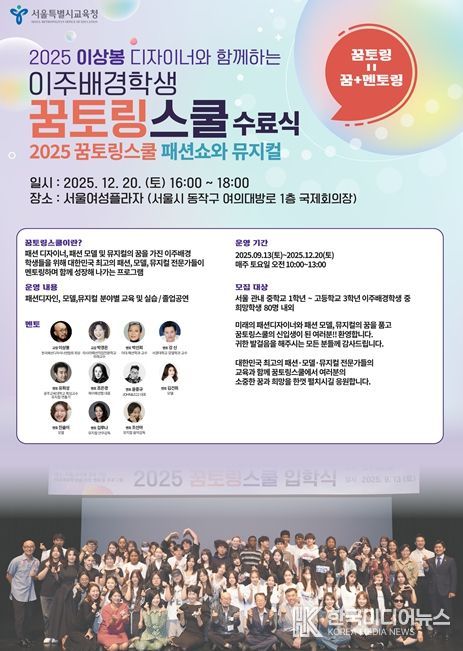 [ 한국미디어뉴스 이원영 기자 ] 서울특별시교육청은 오는 12월 20일, 다양한 문화적 배경을 가진 청소년들이 예술로 하나 되는 '2025 전문가와 함께하는 이주배경학생 꿈토링스쿨'수료식을 개최한다.