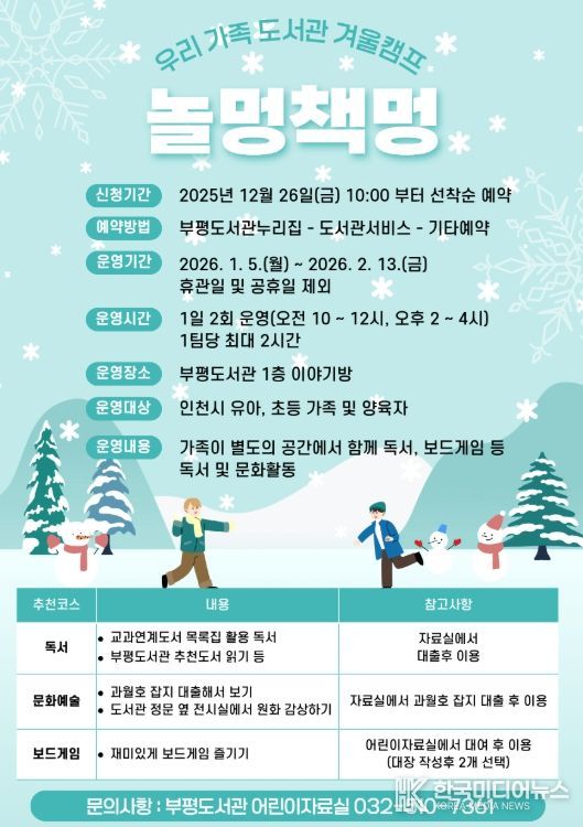 [ 한국미디어뉴스 이원영 기자 ] 인천광역시교육청부평도서관은 겨울방학을 맞아 유아·초등 자녀를 둔 양육자를 대상으로 ‘우리 가족 도서관 겨울캠프 '놀멍책멍'’을 운영한다.